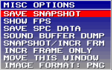 - Save Snapshot - Saves a snapshot as either .pcx (8bit), .bmp (16bit), or .png (32bit ARGB).